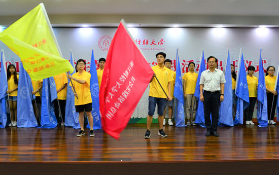 出征仪式上,黄建新和邵晨曲分别为各学院实践服务团和“百名学子寻访百美乡村”专项实践团队代表授旗。