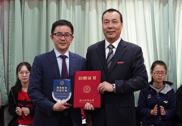 签约仪式上,双方签署了捐赠协议,李金昌代表学校为叶帆校友颁发了捐赠证书和纪念杯,徐晓东代表学校接受捐赠支票。