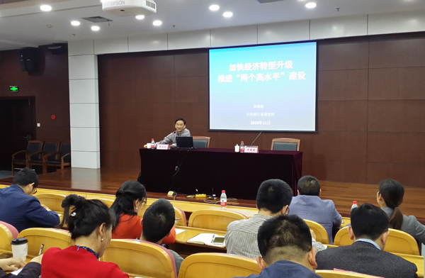 本网讯 11月1日,学校举办青年干部论坛活动,邀请浙江省委党校、浙江行政学院袁涌波教授来校作了一场题为《推动浙江经济转型升级,加快“两个高水平建设”》的专题报告。讲座由机关党委书记、党委组织部副部长、党委统战部副部长申屠莉主持。青年干部班全体学员、机关党委各党支部代表参加讲座。