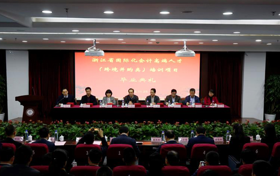 本网讯 11月25日,浙江省国际化会计高端人才(跨境并购类)培训班毕业典礼在我校下沙校区举行。省财政厅副厅长沈磊、副校长王奎泉、省金融办证券期货处处长叶笃银等出席毕业典礼。