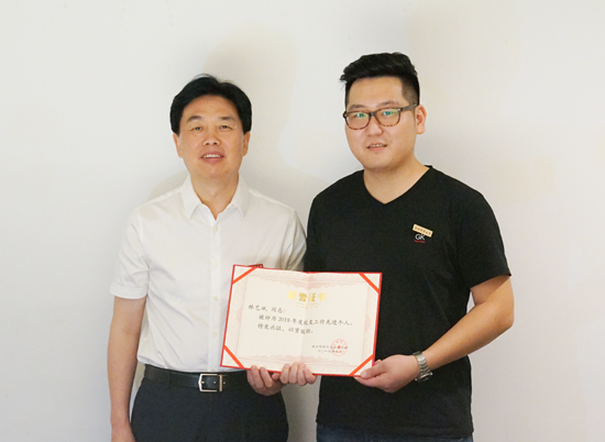 陈金方一行还走访调研了校友企业厦门左手右手文化创意有限公司,并为福建校友会秘书长林艺斌颁发了“2018年度校友工作先进个人”的奖杯与证书。