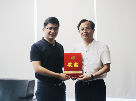 黄建新一行还走访看望了我校2004届校友、中信证券浙江分公司业务部副总经理沈海平,并向其颁发了45周年校庆的邀请函。