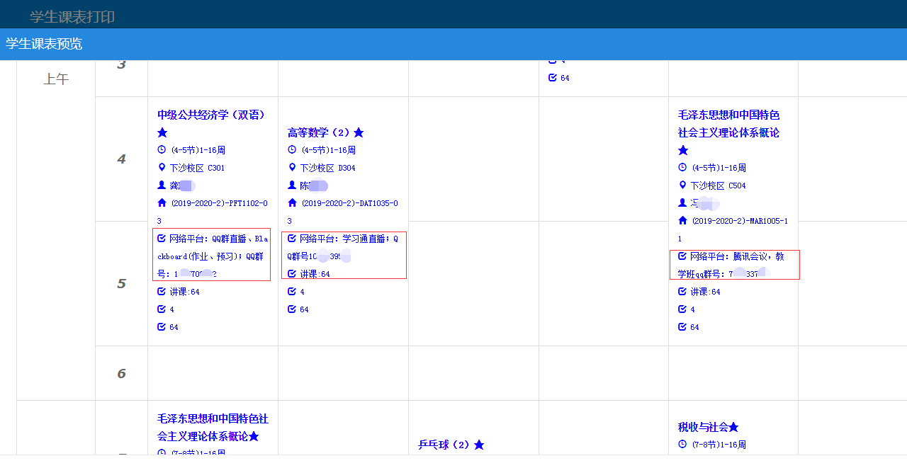 精准化管理。根据 2019-2020学年第二学期课表,各学院(部)根据本科教学计划实际制定本学院网络教学实施方案,每位教师都需要报备互联网授课方式,每一门课程都要在教务系统标注网络平台、班级QQ或者微信群号,其中也包括延期的实验课的安排。