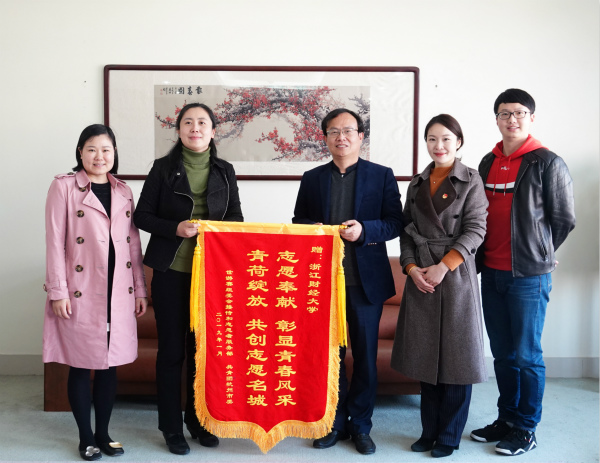 本网讯 3月15日,杭州团市委副书记李莲萍一行来访我校,代表第14届世界游泳锦标赛组委会向我校赠送锦旗和感谢信。校党委副书记黄建新热情接待了来访客人。