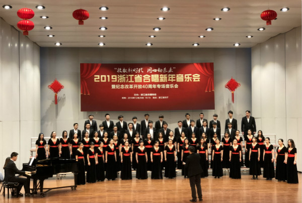 本网讯 12月29日,以“放歌新时代 同心向未来”为主题的2019浙江省合唱新年音乐会暨纪念改革开放40周年专场音乐会在浙江音乐厅举行。我校韵落钱塘合唱团作为全省13支优秀合唱团之一受邀参加。