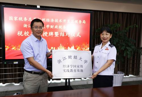 财税学院和杭州经济技术开发区税务局负责人分别代表双方签订税校共建战略合作协议,并共同为浙江财经大学经济学国家级实践教育基地、党建共建单位、工会共建单位、团建共建单位授牌。根据协议,双方将在党建引领、人才培养、智库建设、师资合作、工会共建、学生实习就业、团建共建等领域开展更加深入、有实质性内容的合作共建。