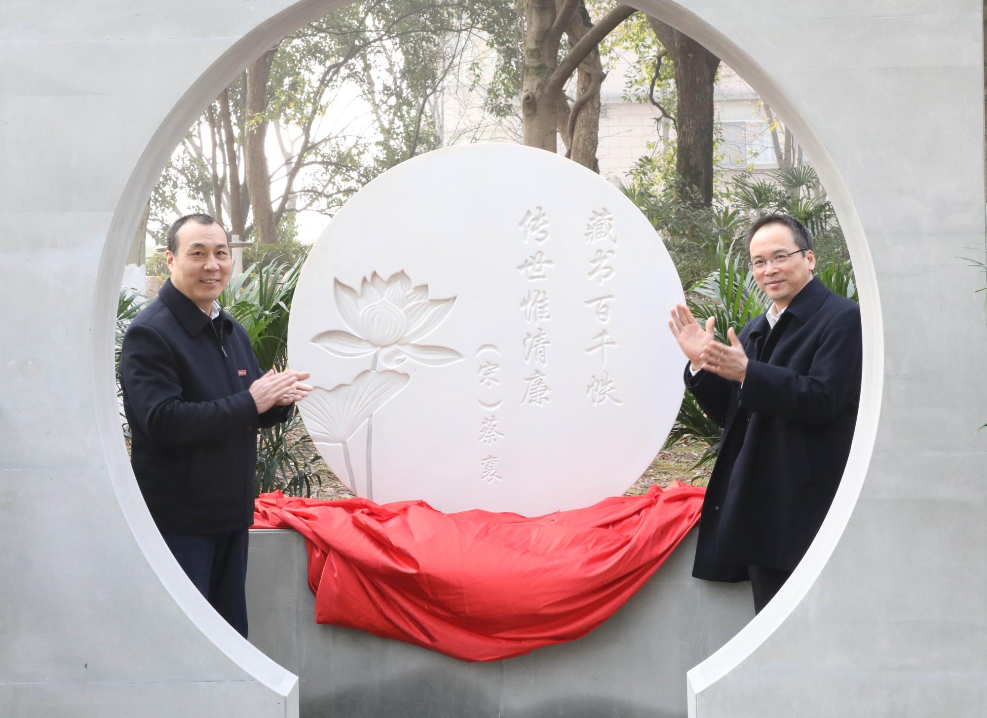 清廉雕塑是学校清廉文化建设实体化的重要标志。设计灵感源自校徽元素,采用中国园林造景特色,取自然之镜像,展清廉之风貌,双面可视化透视设计可交互、可穿行。屏风设计采用青石,双面镜采用汉白玉,寓意“一清二白”。汉白玉双面镜一面刻有宋代名家蔡襄诗句“藏书千百帙,传世唯清廉”名句及荷花,一面刻有元代名家王冕诗句“我家洗砚池边树、朵朵梅花淡墨痕。不要人夸好颜色,只留清气满乾坤”及梅花元素。