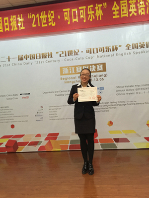 12月5日,由中国日报社、可口可乐大中华区联合主办的“21世纪•可口可乐杯”全国英语演讲比赛浙江省赛区决赛在浙江大学城市学院圆满落幕。我校颜楚桐同学获大赛一等奖。
