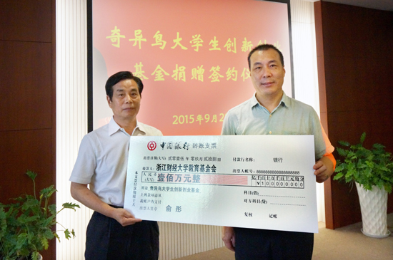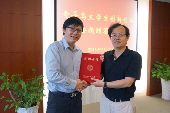 9月28号上午,奇异鸟大学生创新创业基金捐赠签约仪式在行政楼412会议室举行。杭州奇异鸟饮品科技连锁有限公司董事长特别顾问王顺成、董事长助理林小巳参加捐赠仪式。校领导李金昌、黄建新及学生处、研究生处、计财处、校园建设处、社会合作处等部门负责人、学生代表等出席仪式。