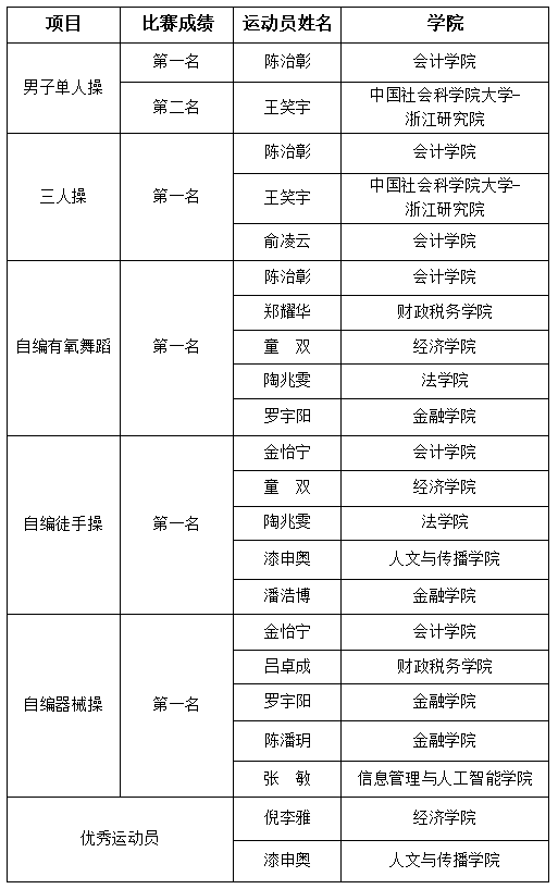 本网讯 近日,2021年浙江省大学生健美操锦标赛在线上举行。我校运动健儿以绝对优势包揽所参赛项目的全部冠军,创历史最好成绩。陈治彰、王笑宇包揽男子单人操金银牌,倪李雅、漆申奥获“优秀运动员”荣誉称号。