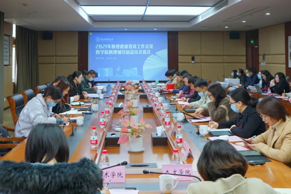 会议对学校和各学院2021年心理健康教育工作进行了回顾总结,分析了工作中存在的问题与不足,并提出了下一年工作思路。会议同时对学院心理辅导站进行了考核,经济学院、人文与传播学院获评学校2021年度优秀学院心理辅导站荣誉称号。
