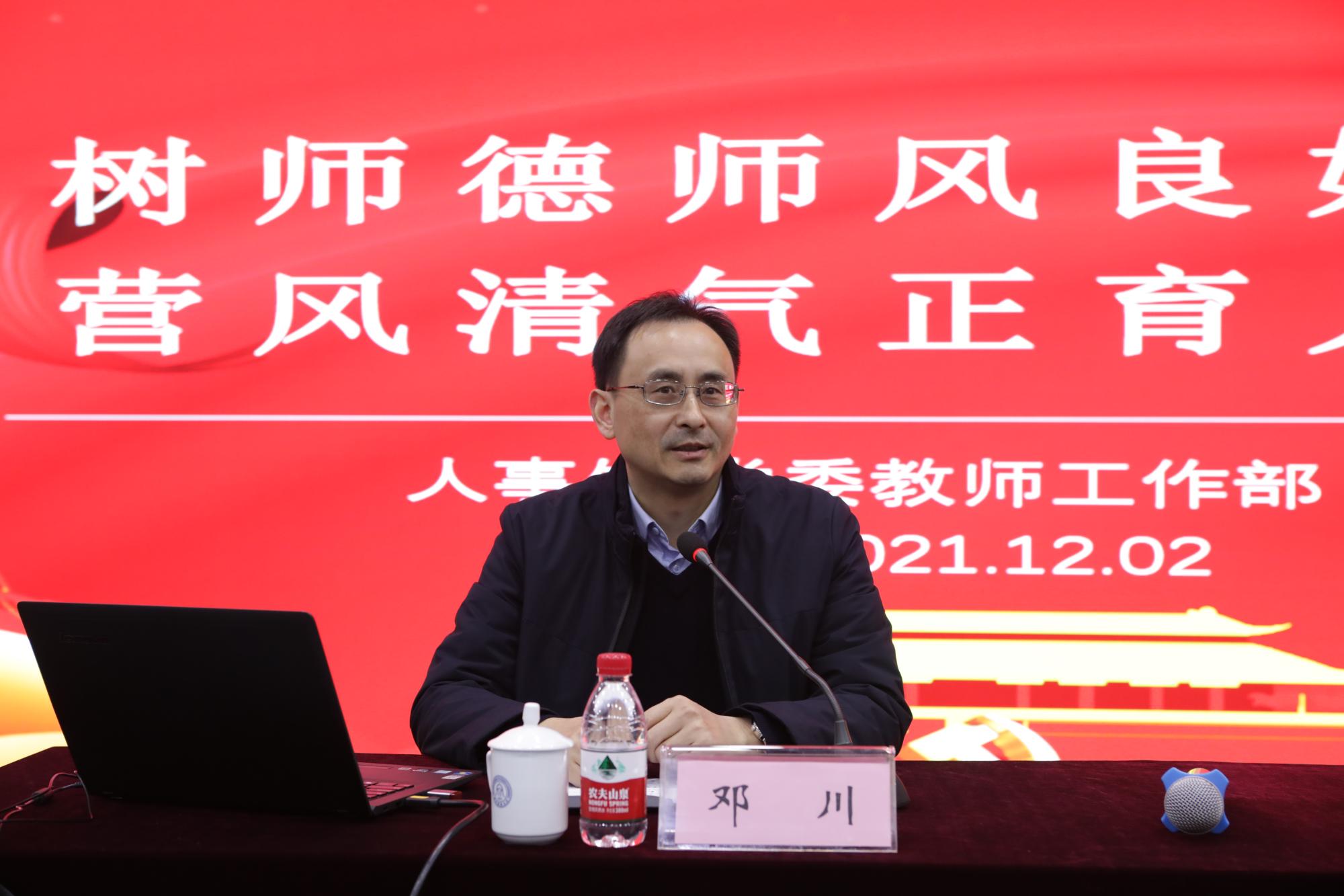 人事处处长、党委教师工作部部长邓川以《树师德师风良好形象 营风清气正育人环境》为题,通过梳理师德师风的相关政策文件、通报违反高校教师职业行为的典型案例、介绍学校加强师德师风建设的具体举措,给大家上了一堂警示教育课,具有很强的针对性和指导性。