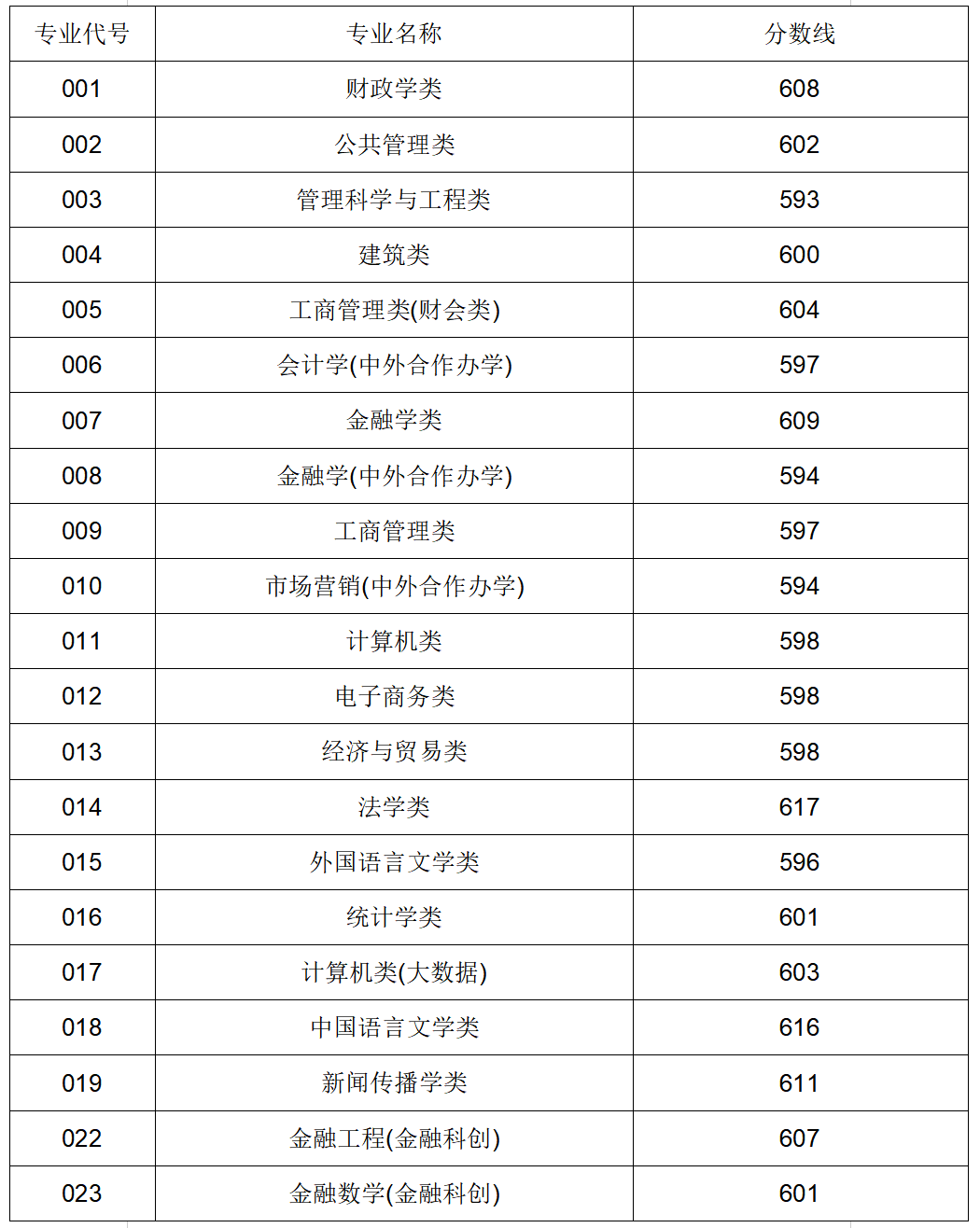 今年报考我校的生源数量充足,生源质量良好。学校录取最高分为639分,考生录取在财政学类。投档线最高分专业为法学类,投档分为617分,高出省特殊类型招生控制线25分。学校所有招生专业(类)投档平均分605.9分,高出省特殊类型招生控制线13分。各个专业(类)录取投档分较去年均有提升。