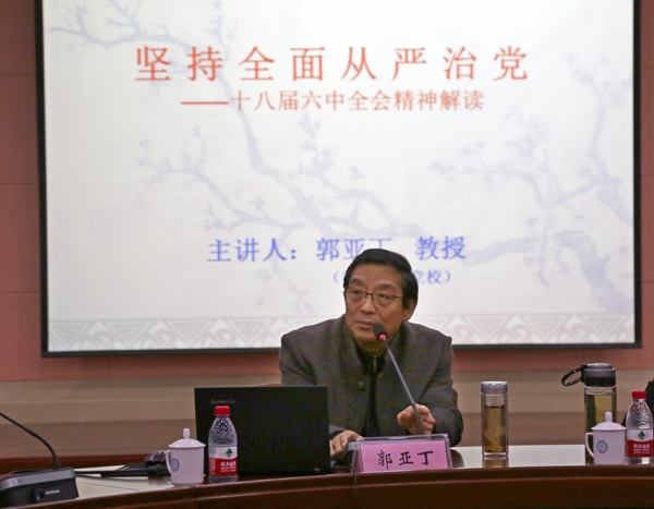 郭亚丁教授结合中国历史发展及中国梦的伟大实践,从十八届六中全会的背景意义、《准则》《条例》内容要点、全会精神中的亮点等三个方面,对全会精神进行了深刻阐释和生动解读。他指出,党的十八大以来,以习近平同志为核心的党中央身体力行、率先垂范,坚定推进全面从严治党,净化党内政治生态,赢得了党心民心。全会以党章为根本依据,突出强调了政治纪律,体现了思想建党和制度治党相结合的鲜明特点,继承和创新有机统一,为推进全面从严治党、提高党的创造力、凝聚力、战斗力提供了有力的制度保障。