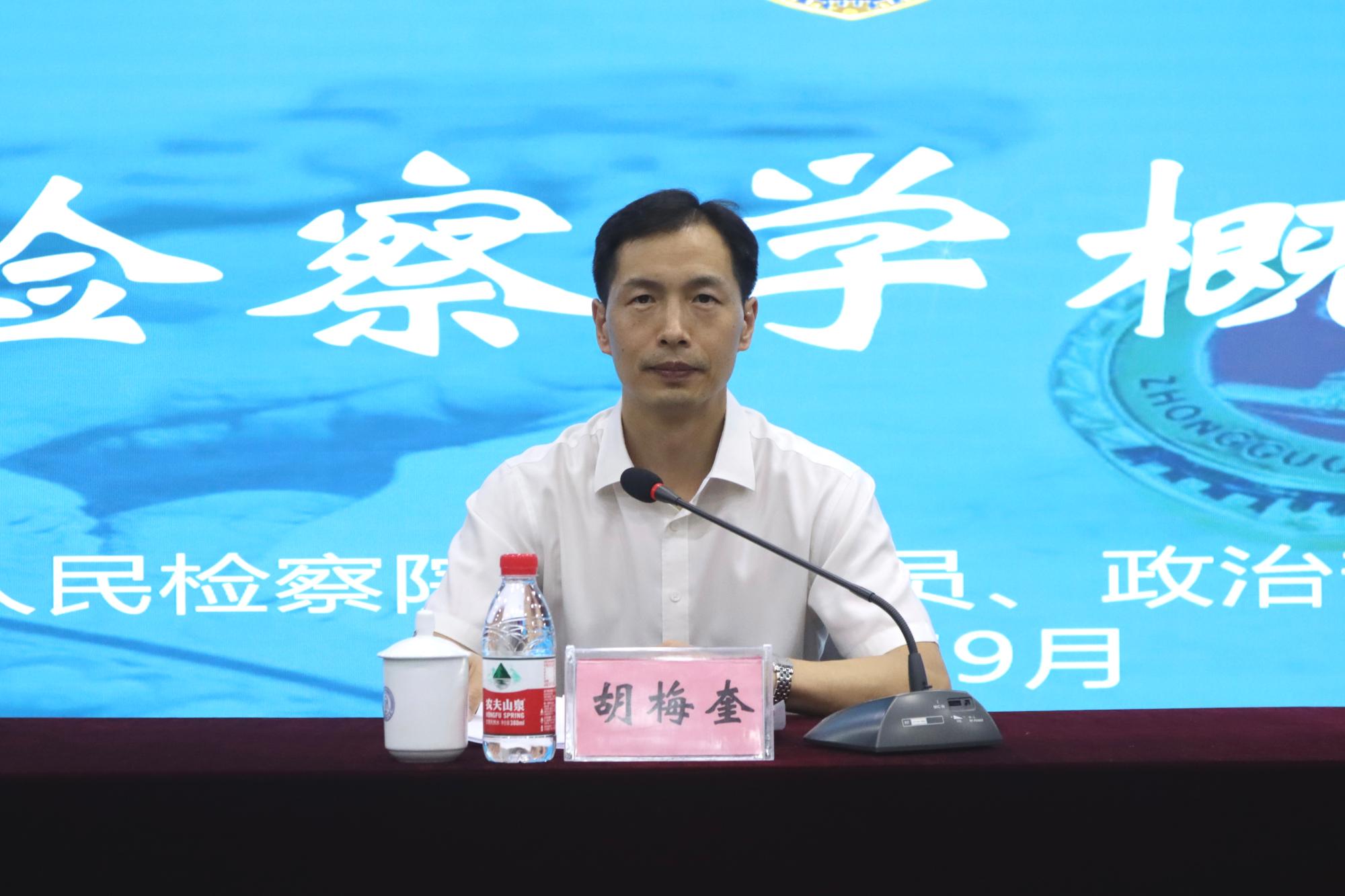 本网讯 9月13日,浙江省人民检察院党组成员、政治部主任胡梅奎受邀为我校法学院300余名师生讲授《检察理论与实务》选修课程第一讲。副校长李占荣教授主持。