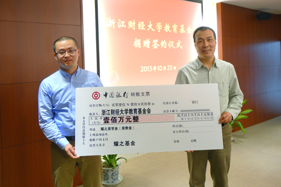 党委书记陈根芳代表学校接受捐赠支票