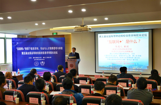 浙江大学电子服务研究中心主任、教育部高等学校电子商务类专业教学指导委员会副主任陈德人教授和东南大学经济管理学院院长、教育部高等学校物流管理与工程类专业教学指导委员会副主任委员赵林度教授分别以“互联网+带来的社会与经济变革”及“互联网+背景下信息学科学科建设思考”为主题作了精彩的主旨报告。江西财经大学信息管理学院原院长万常选教授、中南财经政法大学信息与安全工程学院原院长刘腾红教授、我校信息学院院长张文宇教授等分别介绍了各自学院在“互联网+”背景下的学科、专业、人才培养的思考和举措。中央财经大学信息学院博士生导师章宁教授、吉林财经大学于卓熙教授、浙江工商大学计算机与信息学院琚春华教授等分别作了精彩的主题发言。