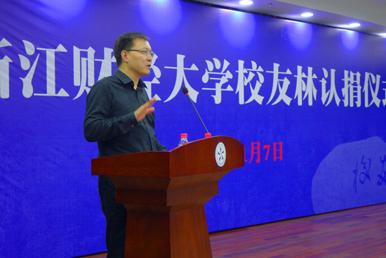 11月7日下午,“饮水思源,情系浙财”校友林认捐仪式在学术中心第四报告厅举行。陈根芳、李金昌等校领导,各相关职能部门负责人,校友总会副会长、渤海银行上海自贸区分行市场营销总监黄力寅,杭州校友会副会长兼秘书长、浙江兆久成信息技术股份有限公司董事长张将勇,杭州海利服饰有限公司董事长王坚等校友及在校师生代表出席了仪式。
