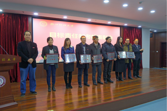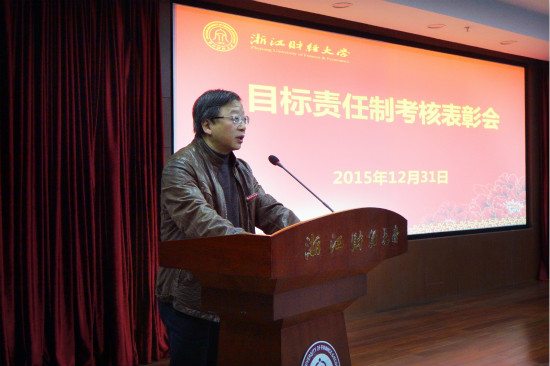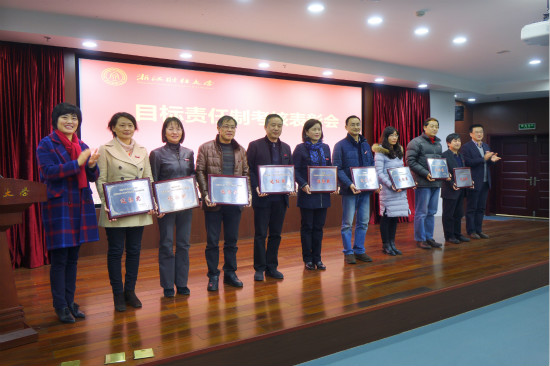 钟晓敏宣读了学校关于2013-2015年目标管理责任制终期考核奖励的决定。经济与国际贸易学院等15个单位、人事处等13个部门分获一、二、三等和达标奖;信息学院等5个单位获进步奖。校领导为获奖单位颁发了奖牌。