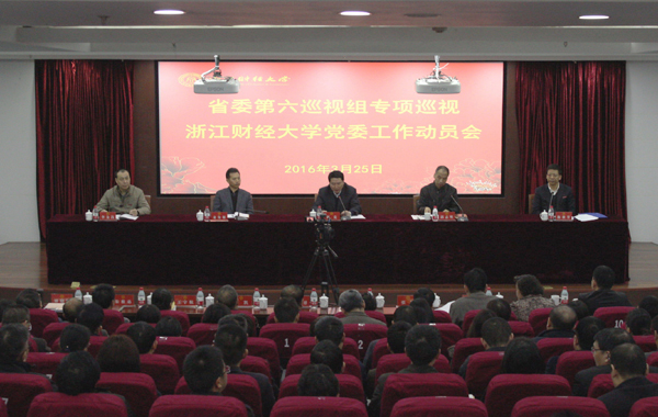 本网讯(记者 程晓东)根据省委统一部署,3月25日上午,省委第六巡视组专项巡视浙江财经大学党委工作动员会召开。省委第六巡视组组长赵克就即将开展的专项巡视作了动员讲话,省委巡视工作领导小组办公室副主任邱志明就配合做好巡视工作提出要求,校党委书记陈根芳主持会议并作表态发言。
