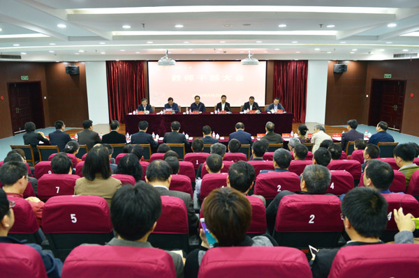 学校在学术中心第四报告厅召开教师干部大会。省委组织部副部长、省委两新工委书记张学伟,省委教育工委副书记、教育厅副厅长鲍学军,省委组织部干部三处处长蒲晓斌,省委教育工委干部处副处长朱伟等出席会议。校党政领导班子成员,中层干部,高级专业技术职务人员代表,民主党派负责人,教代会、职代会执委会成员,近三年退下来的校级老领导参加会议。鲍学军主持会议,蒲晓斌宣读干部任免文件。