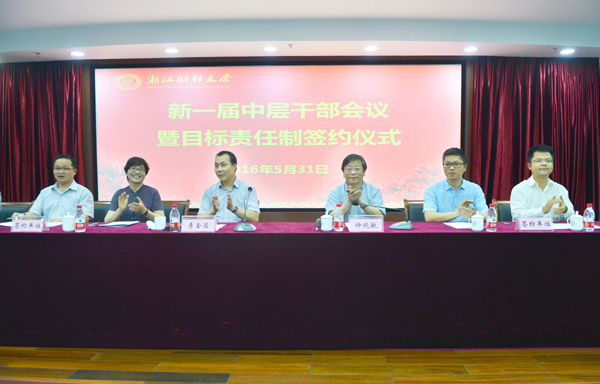 李金昌、钟晓敏分别与学科性学院代表工商管理学院、经济学院,非学科性学院代表继续教育学院(继续教育处),研究院代表土地与城乡发展研究院,党政群团部门代表党校办、学生处、人事处、教务处、工会等签订了2016-2019年目标管理责任书。