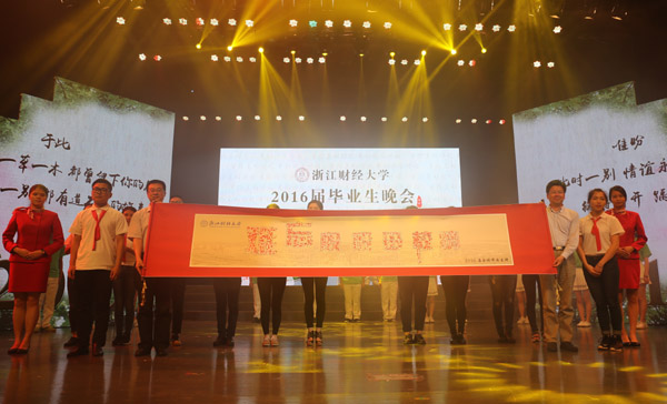 晚会期间,优秀毕业生代表为学校献上一份礼物,一幅印有毕业生手印的画卷,表达了毕业生对学校的殷殷母校情。同时,主持人也宣布了学校图书馆将为毕业生提供终身服务,VPN账号将对校友永久开放,给毕业生们送去了一份惊喜。