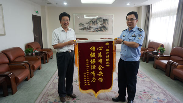 本网讯(通讯员 黄迪)9月26日下午,杭州经济技术开发区公安分局党委副书记、常务副局长徐国宏专程来到学校,感谢我校为G20杭州峰会付出的辛勤工作并送上锦旗。