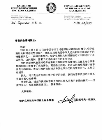 哈萨克斯坦驻上海总领事馆在感谢信中指出,我校在G20礼宾接待过程中,与哈萨克斯坦驻华外交机构紧密配合,热情细致、服务周到,为纳扎尔巴耶夫总统出席G20峰会并圆满完成访华任务做出了一系列卓有成效的工作。