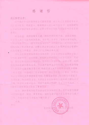 本网讯(通讯员 周宇 林坚)近日,杭州市委市政府、哈萨克斯坦驻上海总领事馆和杭州经济技术开发区公安分局致信我校,对我校圆满完成G20服务保障工作表示赞扬和感谢。