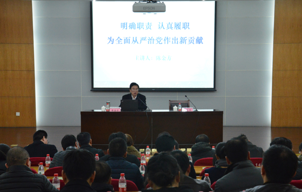 陈金方在会上作了《明确职责,认真履职,为全面从严治党作出新贡献》的专题讲座,深入解读了《中国共产党章程》、《中国共产党问责条例》和《中国共产党党内监督条例》三部党内法规。陈金方根据当前党风廉政建设和反腐败斗争的新形势,以理论与事例相结合的方式,分别从“纪委的主要职责”、“纪委如何履职”、“自觉践行监督执纪‘四种形态’”等三个方面,深入浅出地给与会人员作了专题辅导,对我校纪检监察干部做好监督执纪问责、“四种形态”的运用和“三转”工作将起到重要的指导作用。