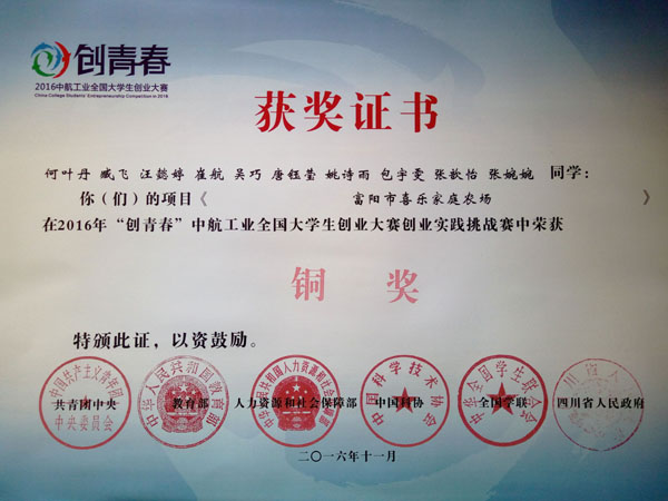 本网讯(通讯员 杨忍)近日,2016年“创青春”中航工业全国大学生创业大赛决赛在电子科技大学圆满落幕。我校东方学院选送的作品《富阳市喜乐家庭农场》(团队成员:何叶丹、臧飞、汪懿婷等,指导老师:叶城均、崔艳明、陈松)获得全国铜奖的优异成绩。