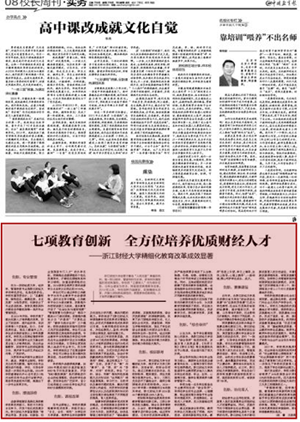 本网讯 4月12日,《中国教育报》第八版以《七项教育创新 全方位培养优质财经人才》为题,从专业管理、选修课程、课程改革、校际联考、综合导师、赛事建设、协同育人等七个方面详细报道了我校精细化教育改革成效。报道指出,浙江财经大学深耕内涵建设,实施精细化改革,开展七项创新实践活动,教育教学成果频现,人才培养质量逐年攀升。