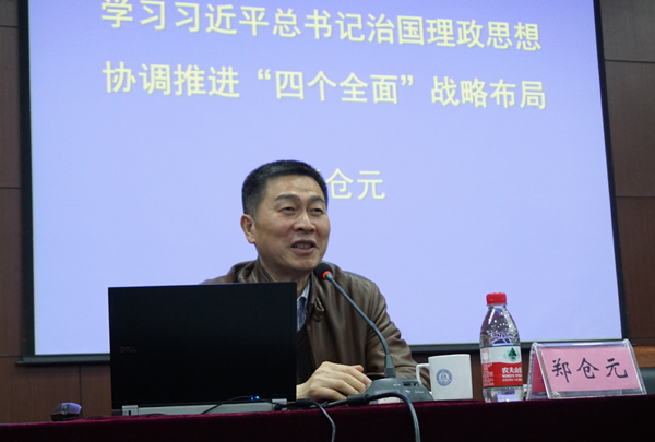 本网讯 3月30日下午,研究生“博文大讲堂”第四讲暨形势政策报告会在我校下沙校区举行。中共浙江省委党校副校长、巡视员郑仓元教授应邀为我校师生作了主题为“学习习近平治国理政思想,协调推进‘四个全面’战略布局”的专题报告。讲座由校纪委书记陈金方主持。