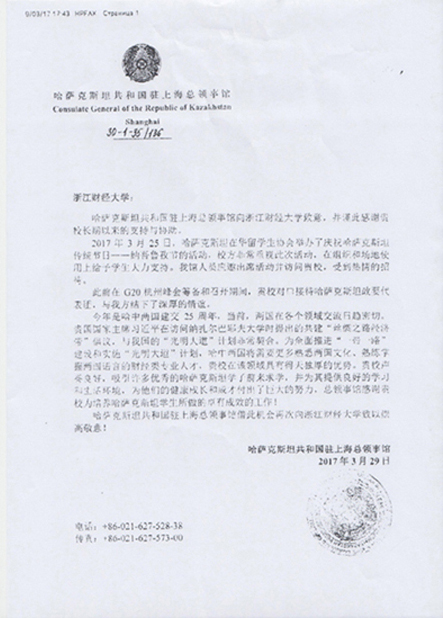哈萨克斯坦驻上海总领事馆在感谢信中指出,浙江财经大学为哈萨克斯坦留学生提供了良好的学习和生活环境,为他们成长和长才做了一系列卓有成效的努力。