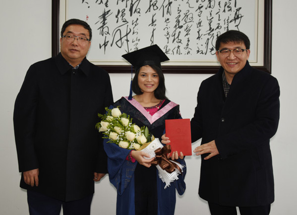 国际学院院长余慕鸿和副院长李汉强为DAO THI HONG HANH同学献上了鲜花和纪念品,对她的顺利毕业表示祝贺,并表达了对她的殷切期望和美好祝愿,希望她能收获生活的幸福和事业的成功,同时能成为中外交流的友好使者,母校永远是她的坚强后盾和精神家园。DAO THI HONG HANH同学表示,虽然只有短短两年学习时光,但她和同学、老师、学校建立了深厚的感情,以后无论走到哪里,都将感恩母校、心系中国。
