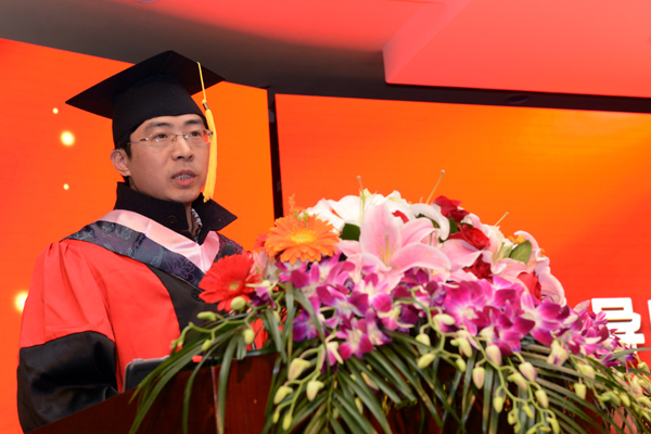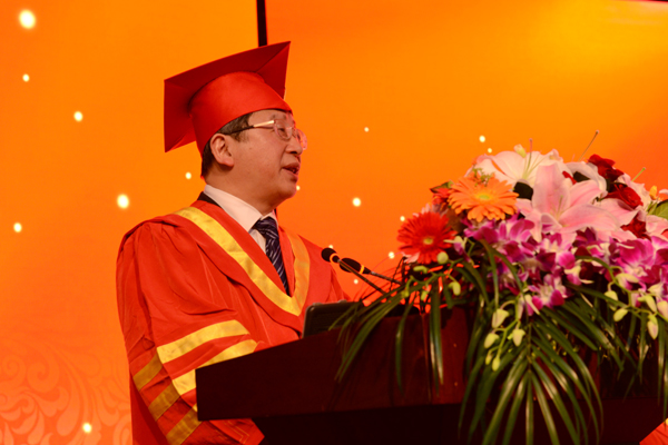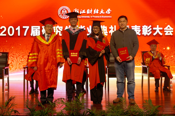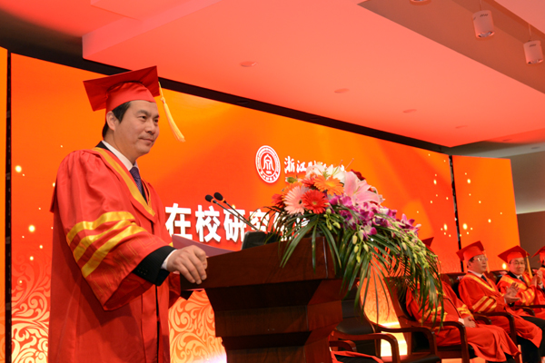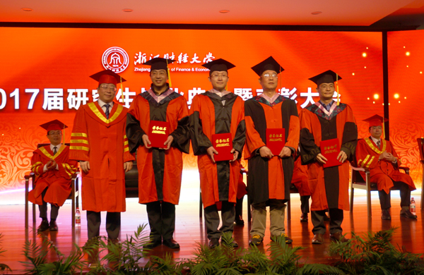 校长钟晓敏以“于斗转星移间 坚守内心永恒”为主题发表了热情洋溢的讲话。他代表学校向顺利完成学业的2017届毕业生表示祝贺,鼓励同学们面对瞬息万变的现代社会,应拥抱变化、勇立潮头,发出属于浙财人自己的呐喊,同时更要保留自己内心深处那一份回归原点、不忘本心的坚持。他希望毕业研究生做到“四个坚持、四个守护”,一要坚持初心不变,守护内心的那一份梦想,以积极乐观的心态,笑对人生路上的荆棘与坎坷,在呵护好自己小家庭梦想的同时,为实现中华民族伟大复兴的中国梦付出自己的努力;二要坚持底线不变,守护人生的那一份纯洁,在面对现实生活五光十色的诱惑和选择时,坚守内心的底线,保有做人的良知,坚持走正道、讲正气、做真人;三要坚持学习不变,守护爱读书的那一份美好情怀,在任何时候、任何环境下,都不要忘了学习,要享受读书、热爱学习;四要坚持关系不变,守护同学间、师生间的那一份温暖,同窗情、师生情、母校情不会随个人成就的高低而变化,只会随着时间的推移而愈加香醇,母校永远是大家心灵可以随时停靠的温暖港湾。